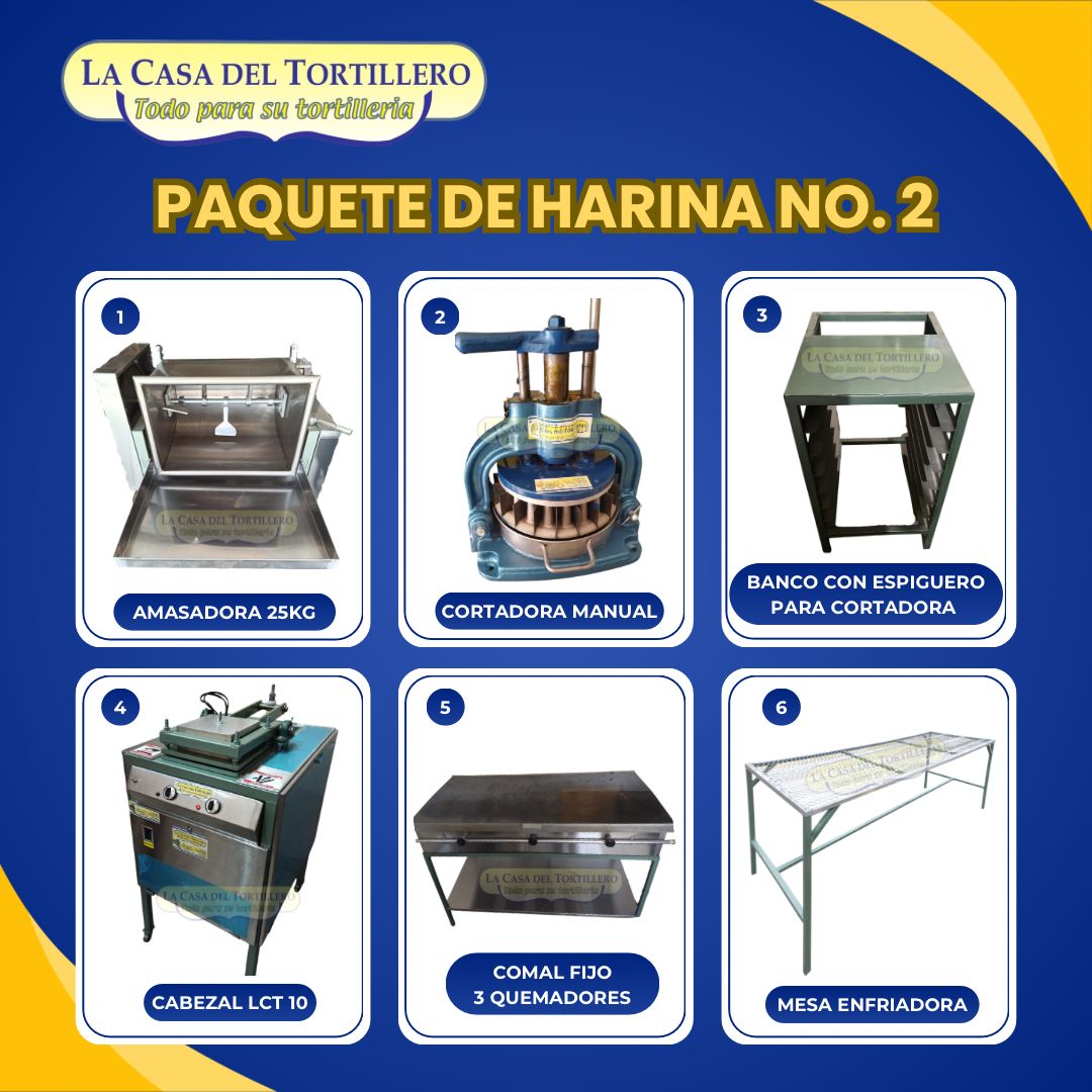 PaquetesAMASADORA 50 KG, CORTADORA MANUAL, BANCO CON ESPIGUERO PARA CORTADORA MANUAL, BOLEADORA LCT, CABEZAL DOBLE LCT, COMAL DE 3 QUEMADORES, ENFRIADOR DE MESA DE 1.85 METROS.