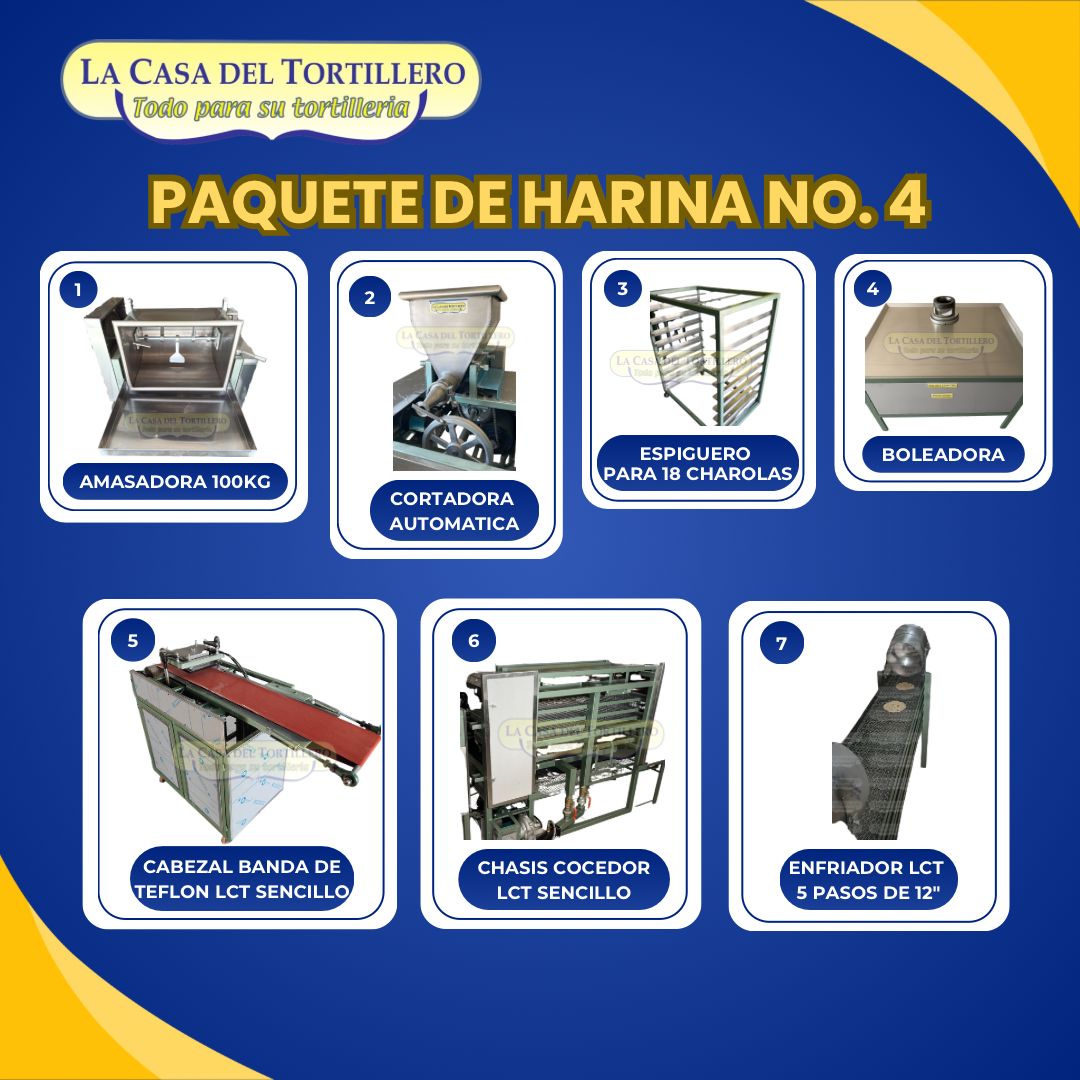 PaquetesAMASADORA 100KG, CORTADORA AUTOMÁTICA LCT, BOLEADORA LCT, ESPIGUERO PARA 18 CHAROLAS, CABEZAL BANDA DE TEFLON LCT SENCILLO, CHASIS COCEDOR LCT SENCILLO, ENFRIADOR LCT DE 5 PASOS MALLA DE 12".