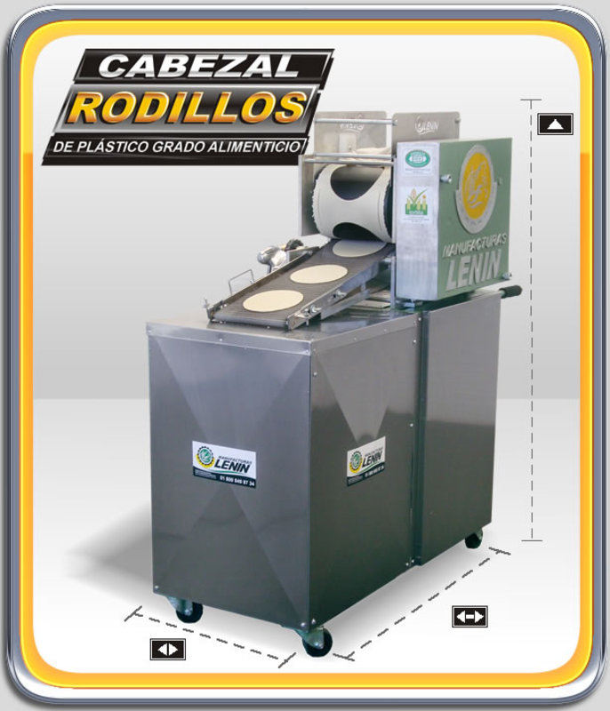 MaízEl Cabezal de Rodillos de Plástico grado alimenticio nos permite fabricar tortillas, gorditas, enchiladas, totopos, pizzerolas y chilaquiles. Cuenta con ruedas y manubrios lo que lo hace de fácil transportación.