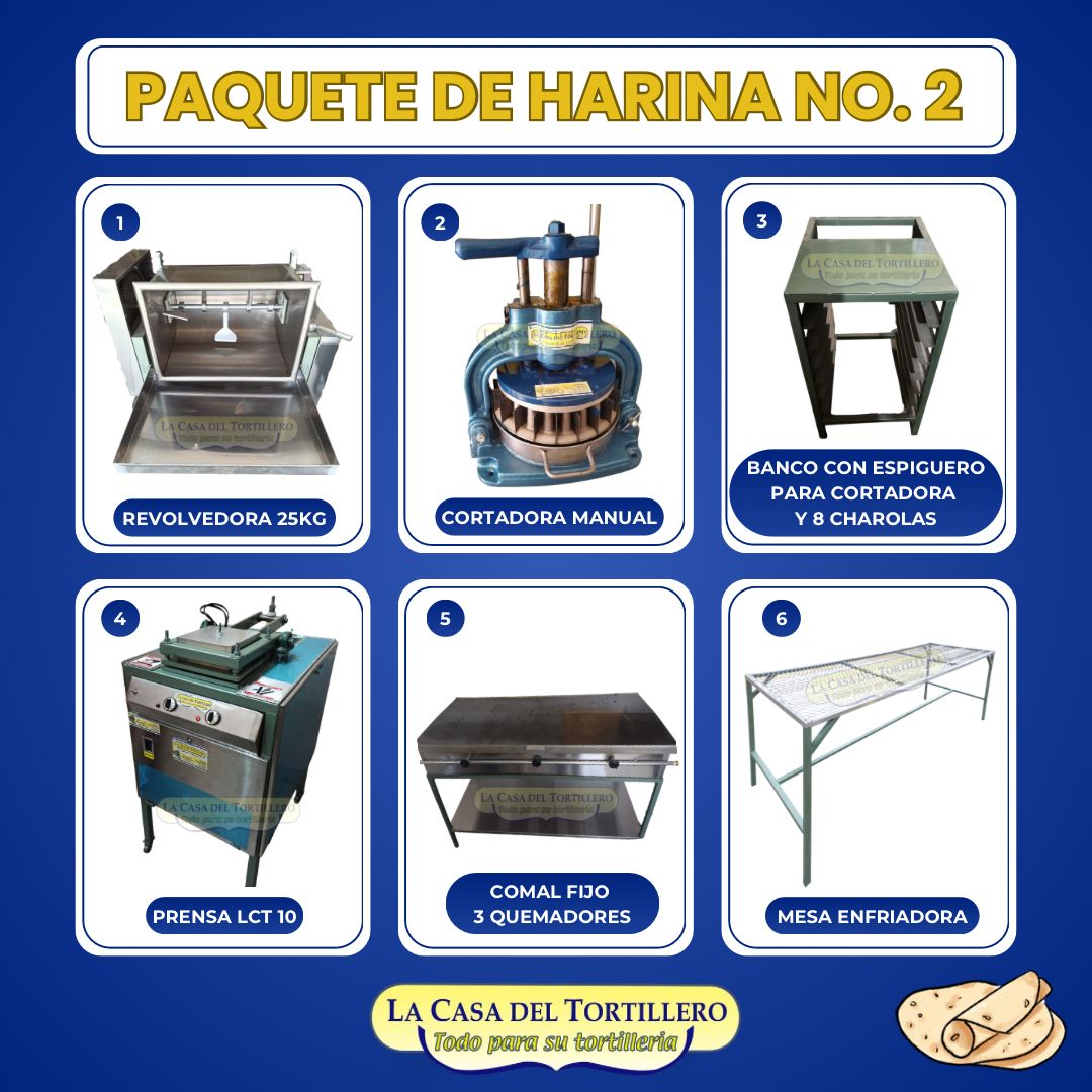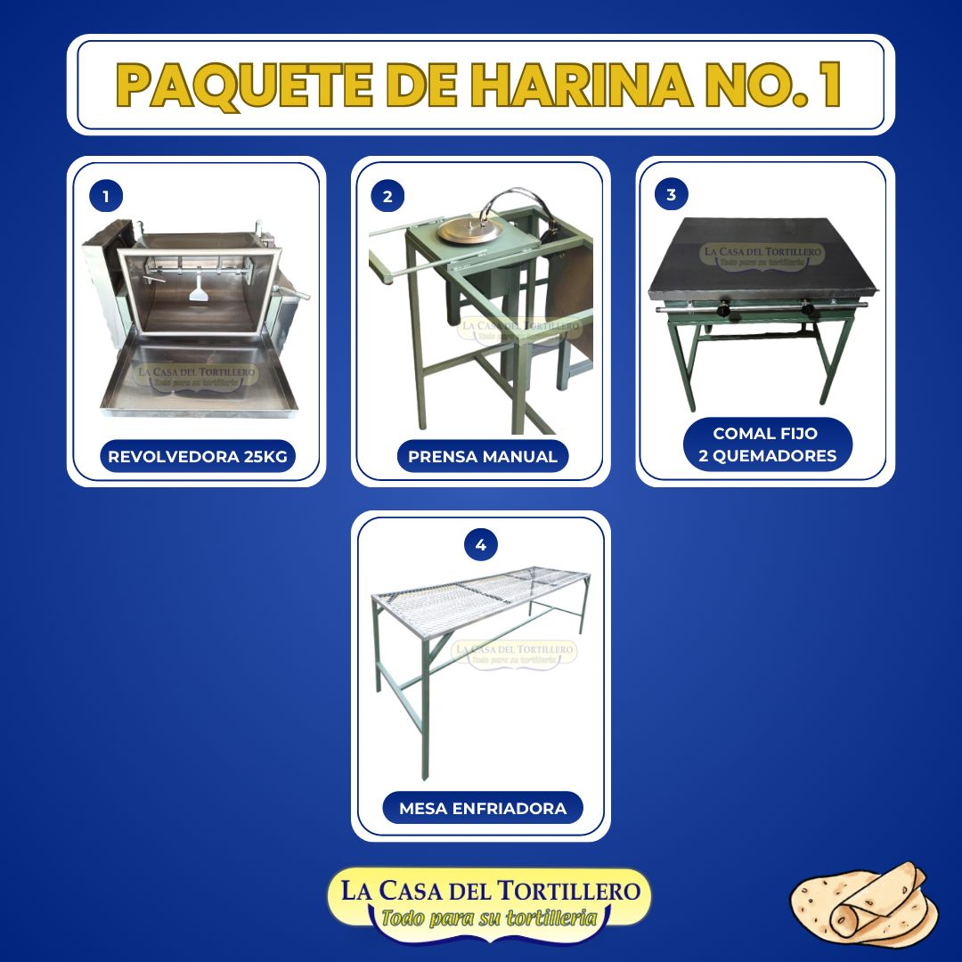 PaquetesREVOLVEDORA DE 25KG, PRENSA MANUAL SENCILLA S/C, COMAL FIJO DE 2 QUEMADORES, MESA ENFRIADORA DE 1.85 METROS.